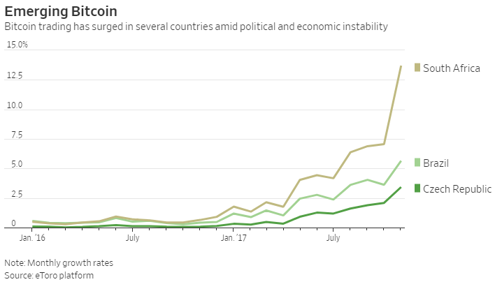 In South Africa, the number of new users trading bitcoin through eToro rose by 671% from January to the end of November last year over the same period in 2016, more than the 574% overall growth.