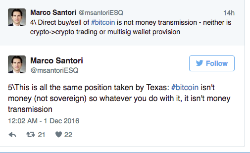 “[Bitcoin] isn’t money (not sovereign) so whatever you do with it, it isn’t money transmission,” attorney and Bitcoin advisor Marco Santori tweeted on the issue.