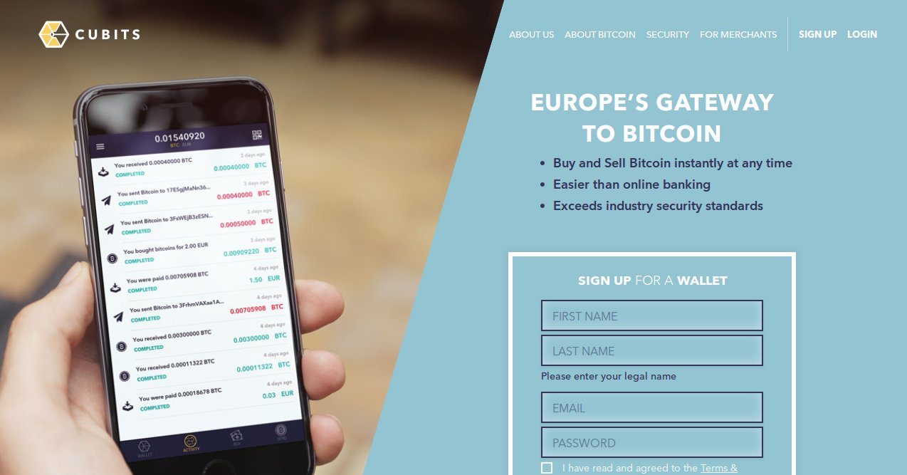 Cubits, known as “Europes Gateway to Bitcoin”, is a company that offers instantaneous exchange of Bitcoin as well as the storing of Bitcoin through their wallet. With a 3-step process to purchase Bitcoin for new users, and with global availability (excluding the USA) through the 17 accepted currencies, Cubits is arguably one of the easiest methods to buy Bitcoin in and even outside of Europe.