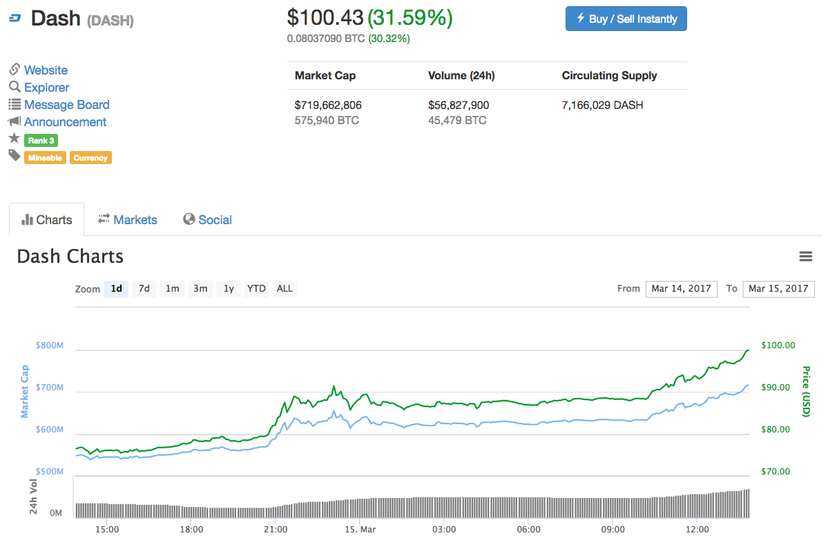 Twenty-four hours ago, Dash was trading at just over $75 USD, and in one day, Dash has made the leap into triple digits for the first time in its three-year history. Dash was first released in 2014 as XCoin and was renamed Darkcoin a mere month later. Finally, in 2015, it was rebranded as Dash, both to avoid a negative “Dark Web” vibe and to appeal to a more mainstream audience.