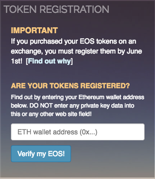 Once you have verified that your Ethereum address holds EOS/eosDAC tokens, go to the EOS countdown website and input your address in the Token Registration box on the left-hand side of the page. If your tokens are already registered, you’ll see a message like the one below. You can also see how much time you have left to register your tokens as well. Keep in mind that eosDAC tokens will be disabled a full day before the EOS tokens are disabled.