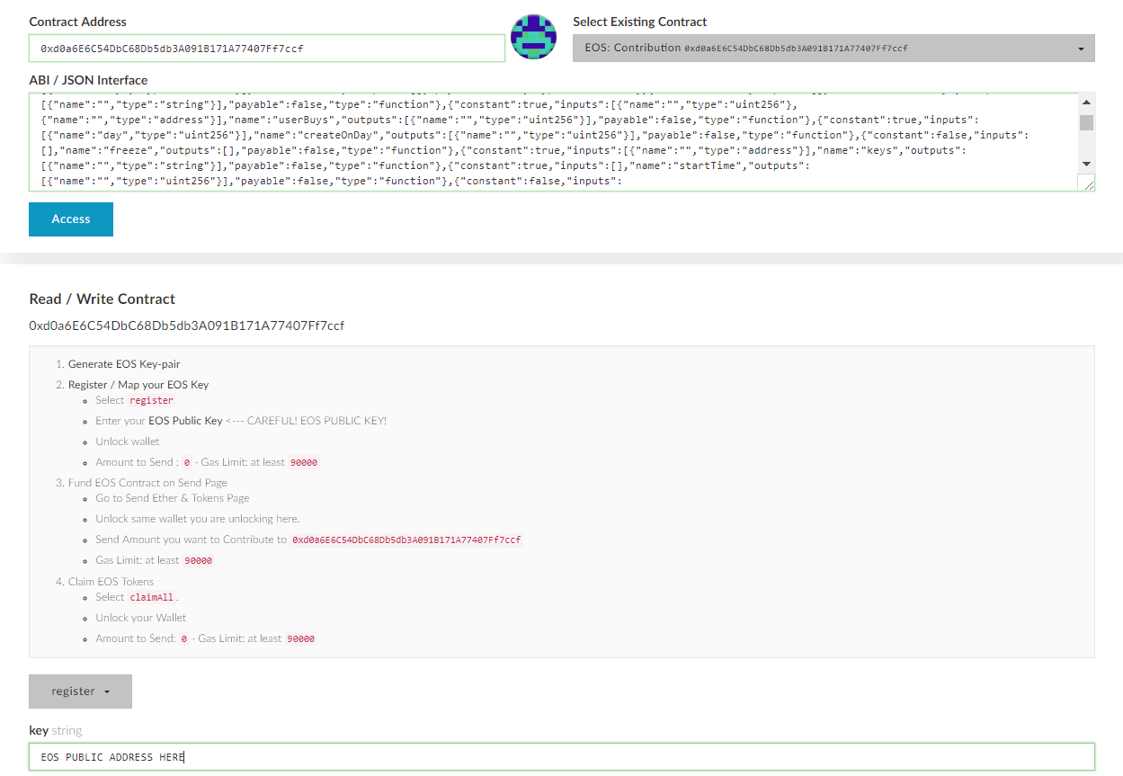 Once you’ve safely backed up your keys, its time to register your EOS address (public key). You will need to do this for all Ethereum addresses that have an EOS/eosDAC token balance. What you’ll be doing is running whats called the “register” method on the EOS Ethereum contract called “EOS Contribution.” This sound very complicated, but MyEtherWallet (MEW) provides a very easy way to do it.