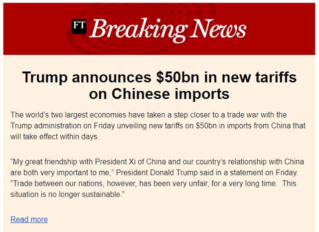 On Friday, the USA and China added to market tensions with additional tit-for-tat trade tariffs. President Trump struck first by announcing $50 billion worth of new tariff’s on imports from China.