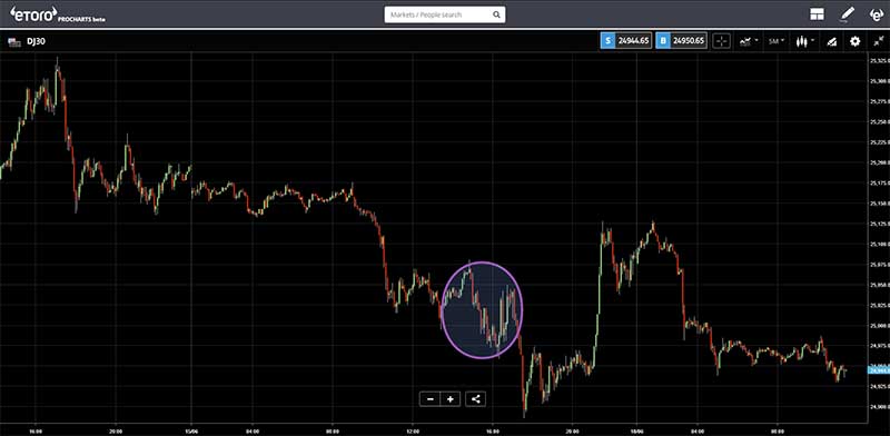 In any case, the measures didn’t seem to have had much effect on the stock markets. In this short-term graph of the Dow Jones, we can see that stocks were already on their way down before the 3.5 hour spat (purple circle).
