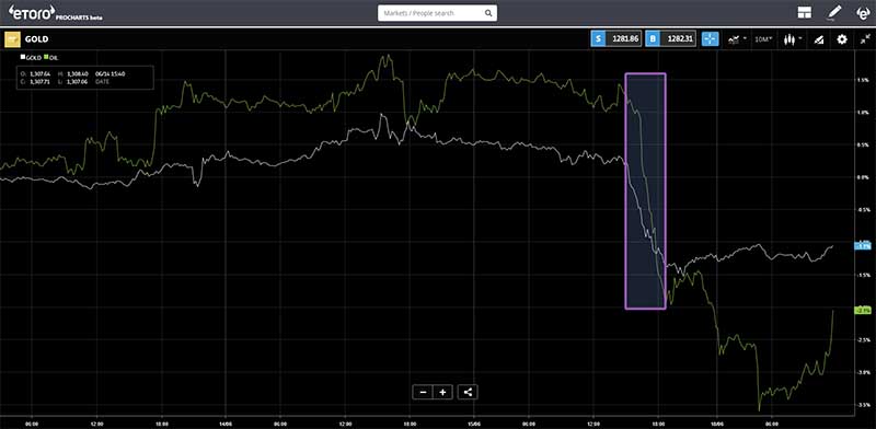 Here we can see gold and crude oil reacting to the updates and plunging rather noticeably from the initial announcement and until well after China’s retaliation.