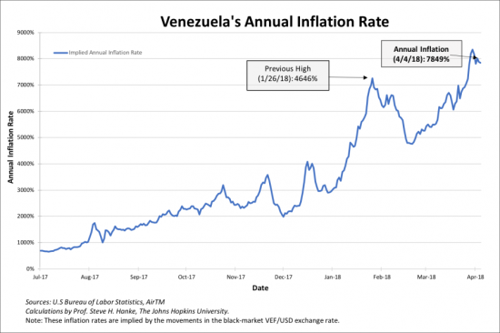 In fact, the International Monetary Fund (IMF) recently criticized Venezuela for not disclosing its economic data and has estimated that the nation’s inflation could exceed 13,000 percent this year. At the same time, the U.S. Department of Labor Statistics puts Venezuela’s annual inflation rate, as of last month, at 7849 percent.