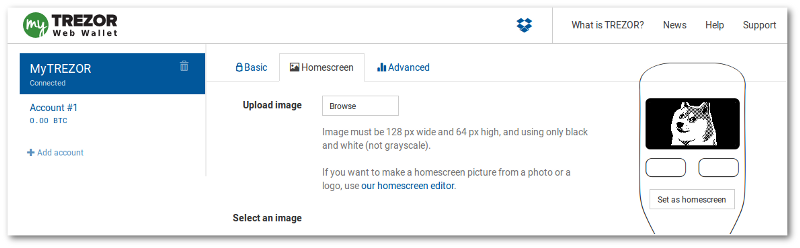 Also, the Satoshi Labs team decided to make the Bitcoin experience humorous and artistic with their new device features. Now users can change their Trezor home screens to various pictures such as the Mt Gox logo, the Doge logo, or really any picture that is 128px wide and 64px tall in black and white. The Trezor’s display will feature the picture every time you power the device up and adds a unique touch to the experience. The home screen gallery has some default images that show some funny crypto-humor, but the feature also allows a custom upload if they meet the requirements listed above.