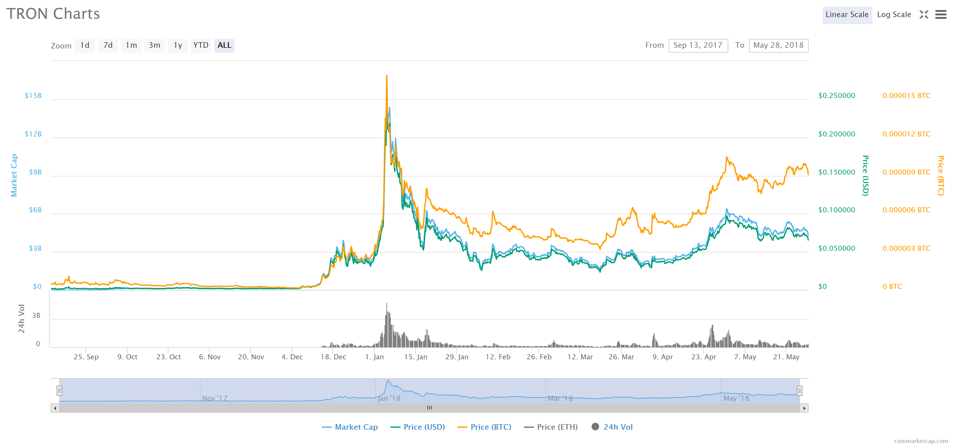 At its peak, TRX saw prices over $0.25, before collapsing to under $0.03. TRX is currently trading at $0.065658, down nearly 10 percent over the last 24 hours.