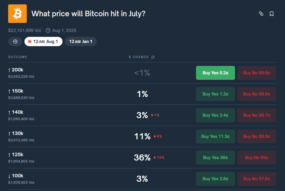 Traders on a decentralized platform are putting real money on Bitcoin’s path this month. According to a new Polymarket poll, 36% of bettors believe Bitcoin will top $125,000 by July 31.