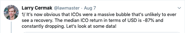 Earlier this week research analyst Larry Cermak boldly proclaimed that the 2017 ICO boom was indeed a bubble that will never recover.