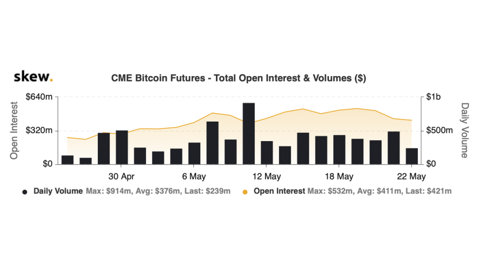 Bitcoin CME futures currently have about $420 million in outstanding open interest, marking a slight decline from recently set all-time highs of $532 million.