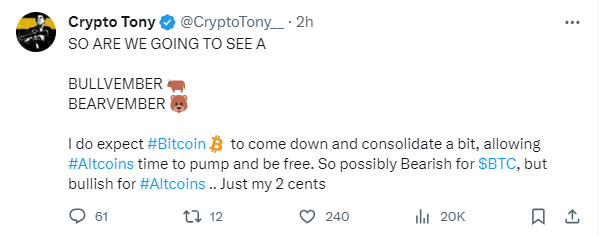 However, experts believe that after the Bitcoin Uptober rally, November’s bull cycle could belong to the altcoins. As BTC continues to consolidate, investors could move to the altcoin and meme coin market in search of volatility.
