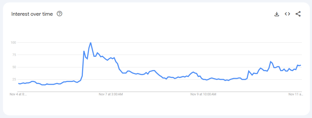 By November 7th, interest levels on the term slightly dropped to just 55 points. Also, web searches for BTC dipped in the following days to just 44 and 37 points. On November 10th, the search term came back, with interest levels at 58 points.