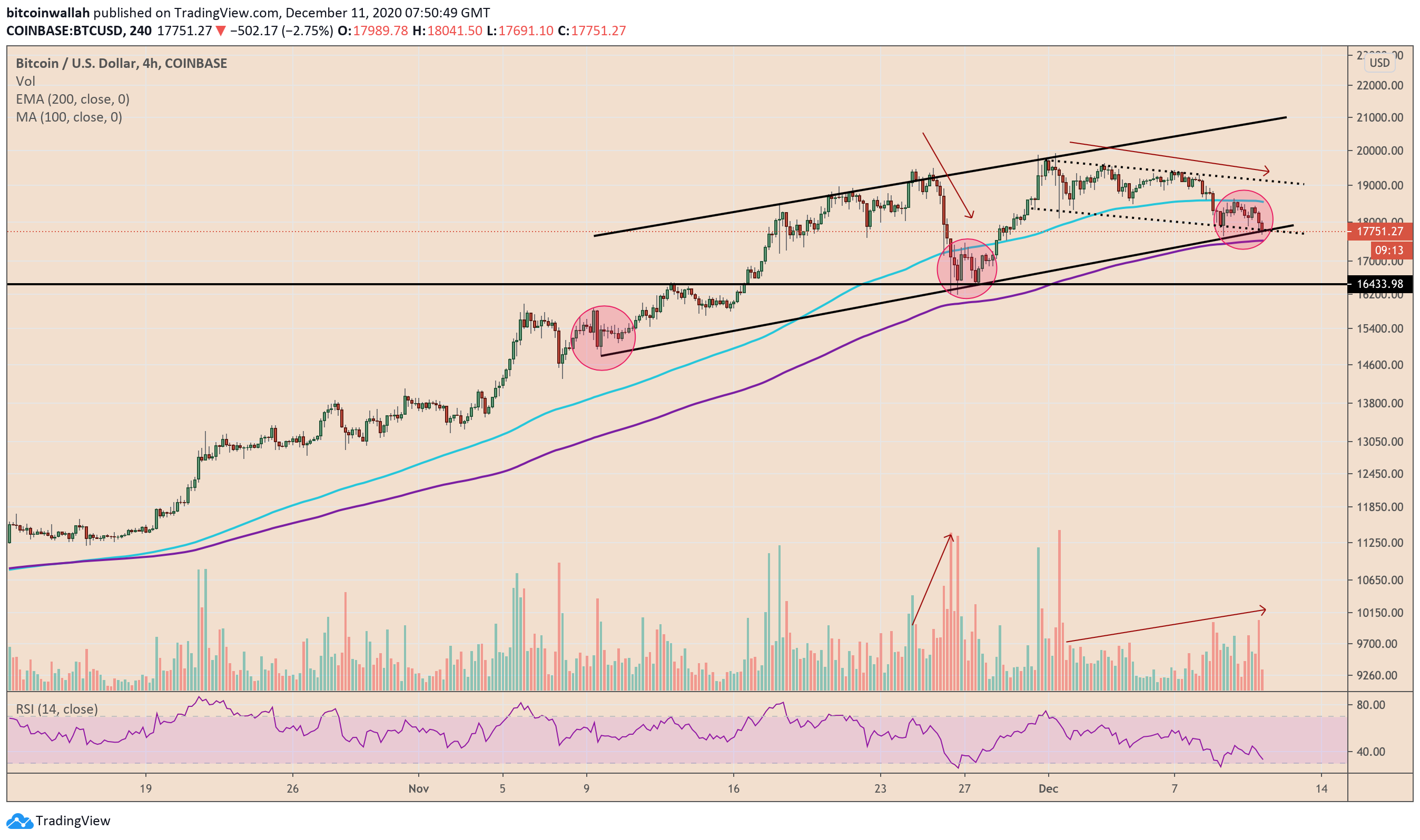 A baseline of another channel formation — a Descending one — is also converging with the Ascending Channel’s support trendline. That doubles up the area’s strength while protecting Bitcoin from further bearish assaults. Tripling up the power is a visible divergence between the cryptocurrency’s rising volume and declining price. It is—technically—bullish.