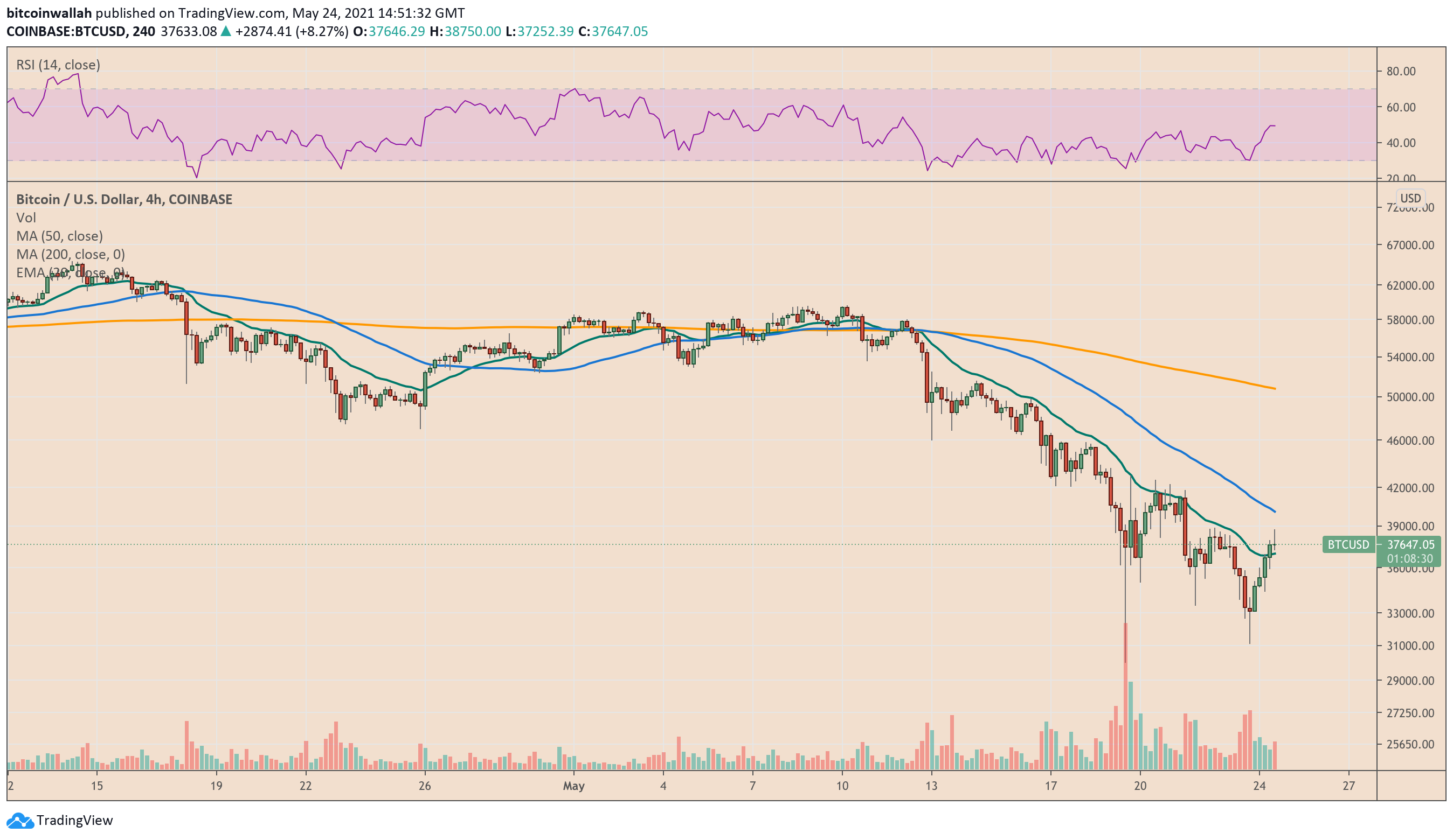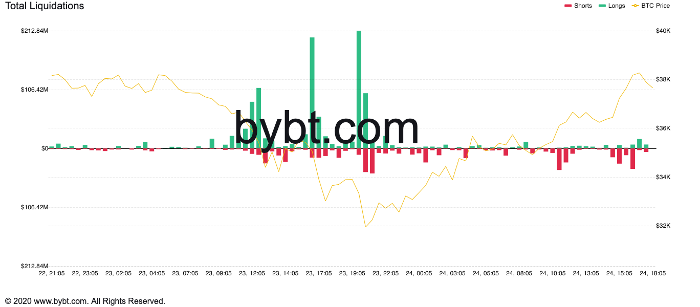 The BTC/USD exchange rate rebounded to an intraday high of $38,750 before correcting lower short-term profit-taking sentiment. At its previous week’s lowest, the pair was changing hands for $31,111 — a 24.55 percent retracement between extreme swing highs and lows in the previous 24 hours.
