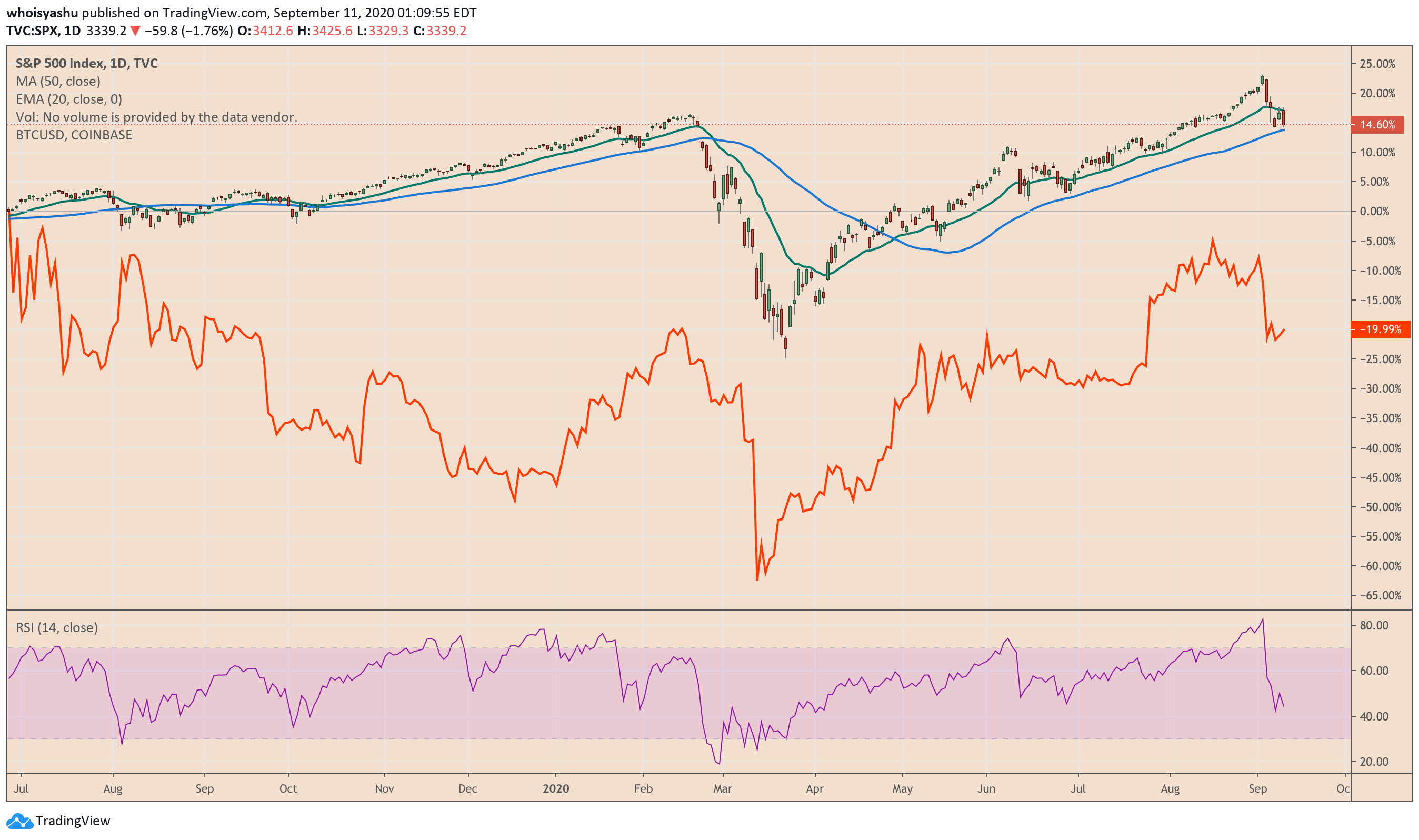 The S&P 500 plunged 59.77 points, or 1.8 percent, to 3333.19 at the Thursday close. BTC/USD lagged the US index, falling a day later by $127, or 1.24 percent, to $10,214, as shown in the chart below.
