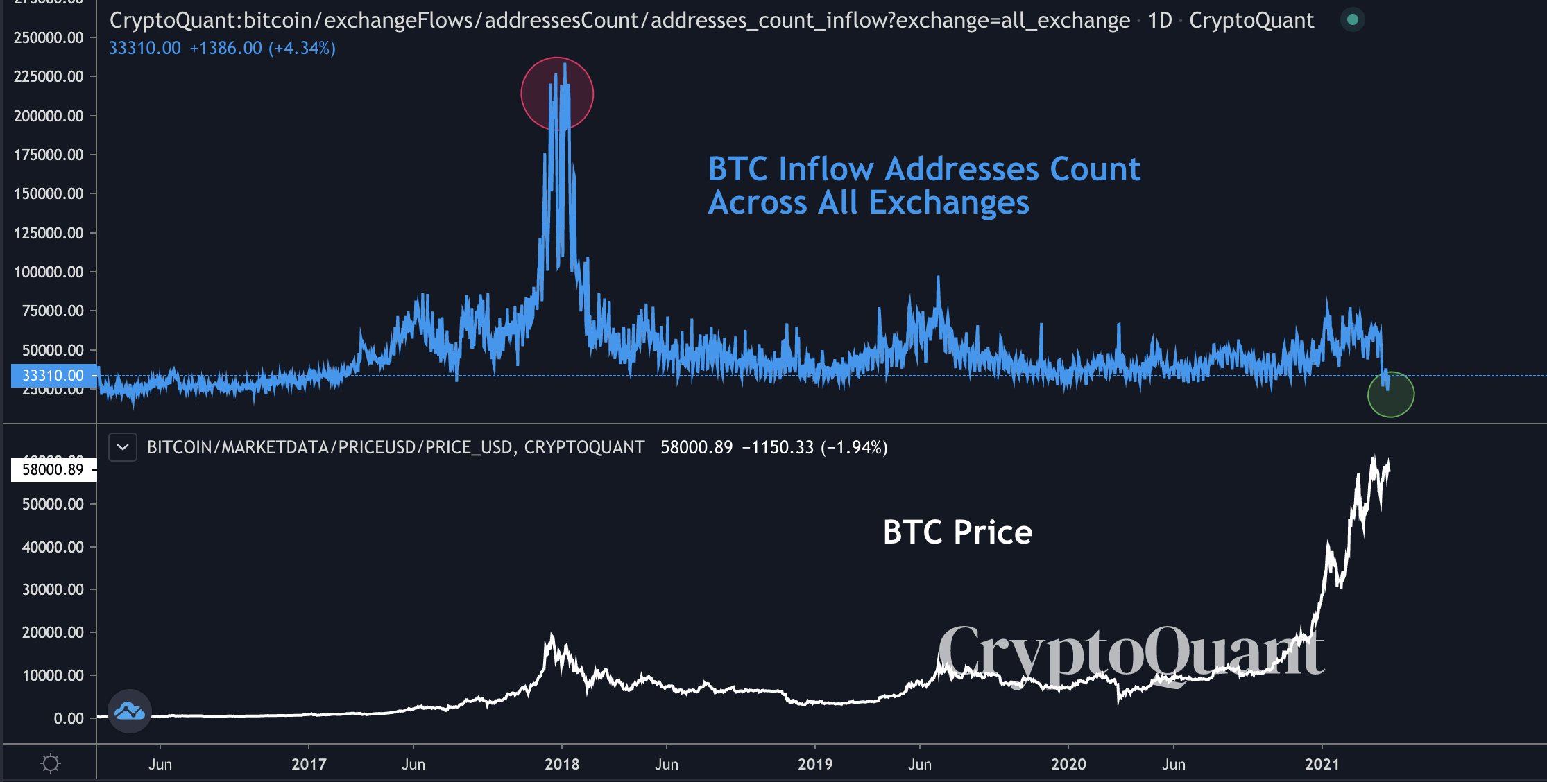 “When the market reaches its peak, everyone deposits BTC to exchanges to sell,” wrote Mr. Young. “# of inflow addresses across all exchanges was at its highest in 2018 Jan, while it hit a three-year low a few days ago. People are holding, not selling.”
