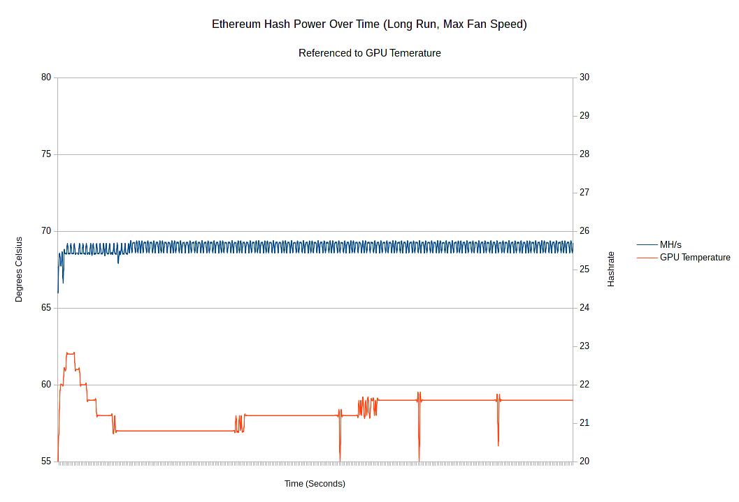 The fan profile kicks in at 63 C, and pushes it down past the regular idle temperature of 56 degrees in some places! More significant is the steady hashrate of 25.6 MH/s once we hit the temperature maximum of 59 C. This could possibly be pushed up even further when voltage and clock settings are added to the Nvidia blob later this year.