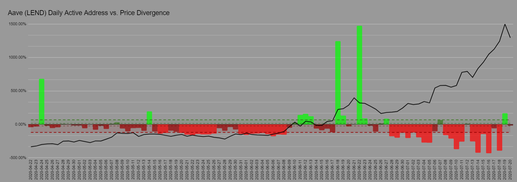 Santiment, a crypto-focused behavioral analysis portal, further noted a growing divergence between the Aave token’s rising price and its falling number of active wallet addresses.