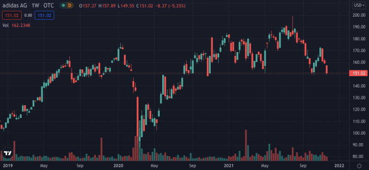 Adidas' stock on the OTC market has had no substantial reaction to the firm's partnerships with Coinbase and The Sandbox; however, it's worth noting that a big press rollout did not accompany these announcements. | Source: OTC: ADDYY on TradingView.com