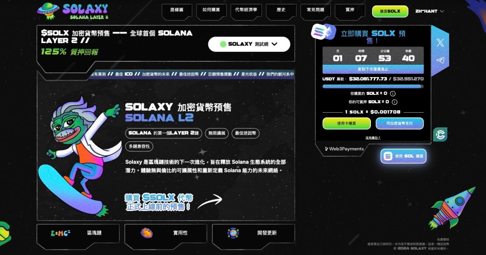 與此同時一場更具爆發力與創新潛力募資熱潮在Solana生態中悄然展開。作為Solana首個Layer 2解決方案與最佳迷因幣之一,Solaxy以超過3,200萬美元預售成績迅速引爆話題,並以每枚0.001708美元價格吸引了大量早期投資者。Solana雖以高速與低費用著稱,但在高流量時期仍存在網路擁堵與性能瓶頸,Solaxy出現正是為了解決這些問題。