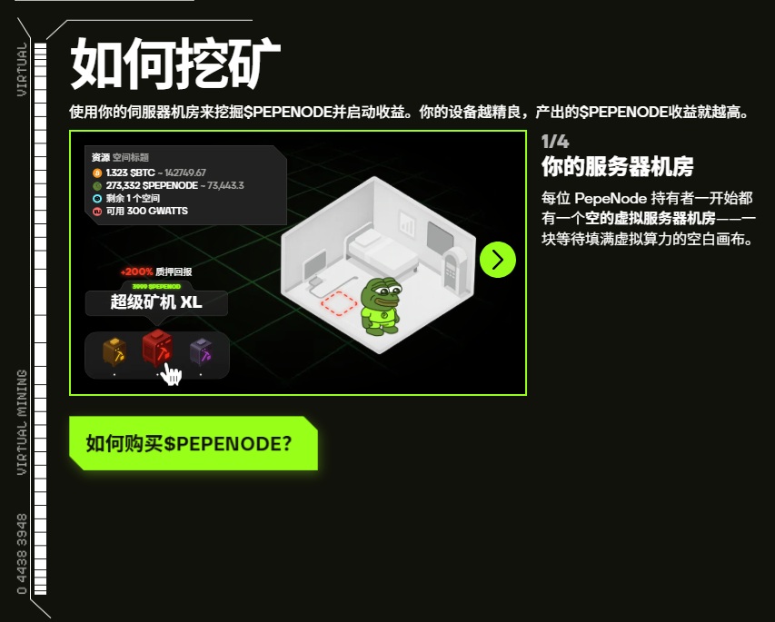 參與者使用PEPENODE代幣購買節點,每個節點都具有獨特的屬性。玩家可以在個人伺服器機房中自由佈局這些節點,以組建最優的meme幣挖礦陣列。系統可在任何時間擴展、調整或升級,賦予玩家對收益生成的完全掌控。