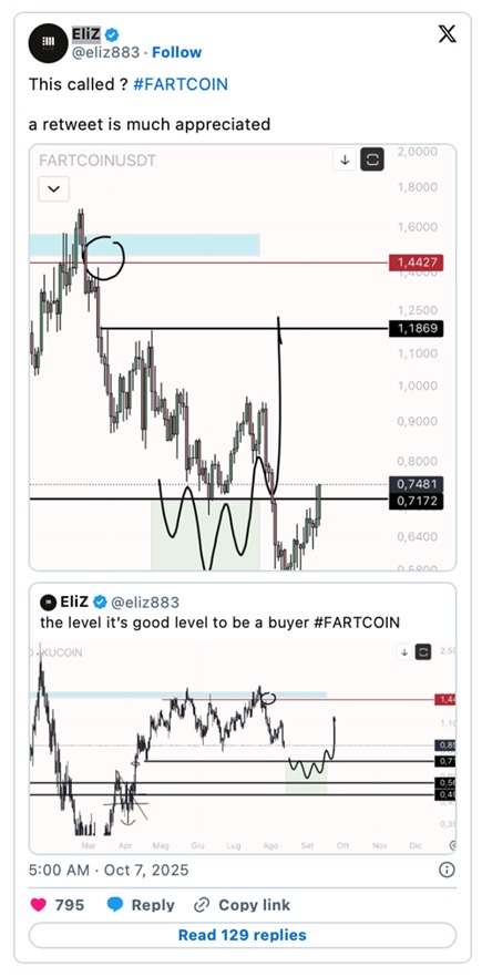 早在8月12日,分析師EliZ就曾指出同樣的綠色區域是理想的吸籌區間,隨後行情如預期發展,FARTCOIN從該區間反彈上行。如果價格達到第二個目標位元,FARTCOIN的市值將達到約14.4億美元,大致與其在今年7月和1月初時的估值相當。