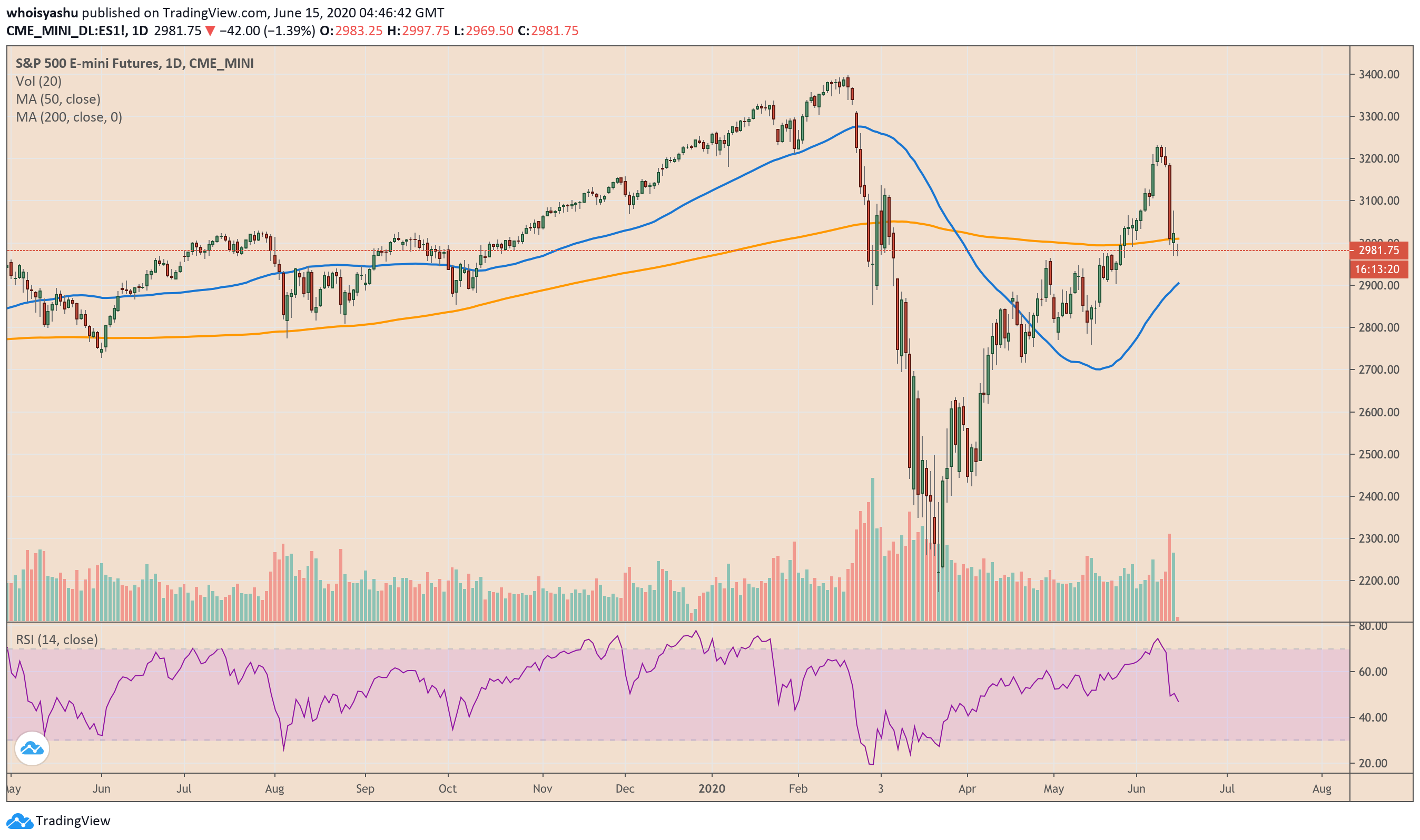 Bitcoin’s losses almost tailed the ones noted in the S&P 500. The cryptocurrency reversed its uptrend after testing $9,481 on Sunday, right around the time the futures tied to the S&P 500 opened negative, now down by 1.21 percent as per CNBC pre-markets data.