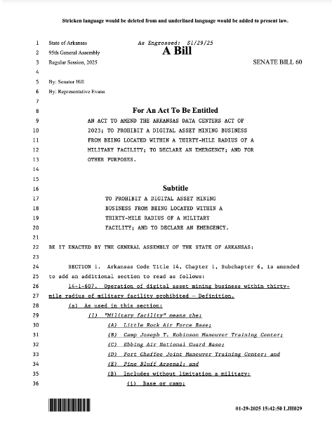 The rejected bitcoin mining operation restriction bill. Source: Arkansas Senate