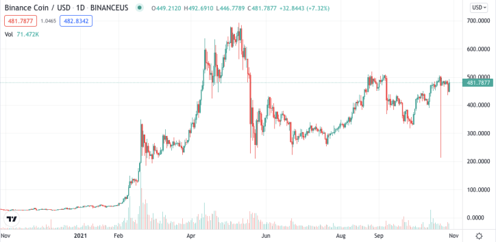 Crypto Fight Club will run on the Binance Smart Chain; Binance's native platform token, BNB, has been volatile but strong throughout the year. | Source: BNB-USD on TradingView.com