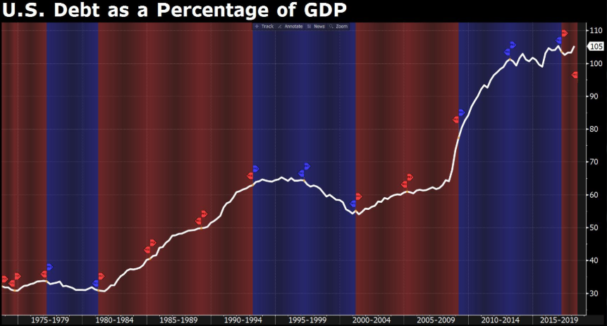 In the following graph, we can see American debt to GDP over the last 50 years. Bloomberg’s Hilary Clark @queenofchartz who produced the graph has admitted that it is the scariest chart she’s ever made.