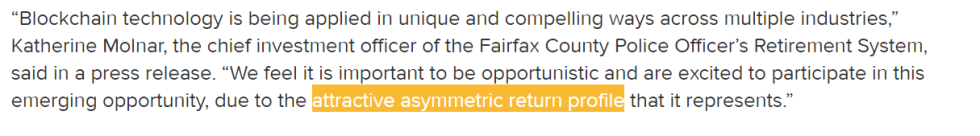 We highlighted some breaking news yesterday about a $40 million investment into crypto by two large public pension funds, but this small bit of news is so fantastic that I’d like to talk about it again today.