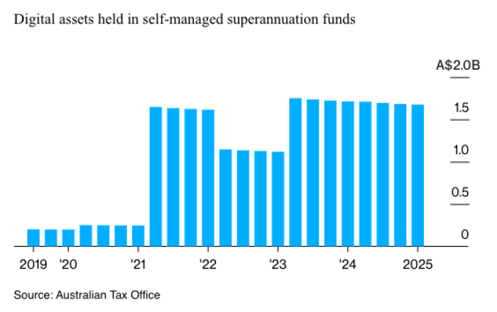 オーストラリア税務局のデータによると、SMSFが保有する暗号資産は2021年第1四半期の5億豪ドル(約540億円)未満から、2025年第1四半期には17億豪ドル(約1,840億円)に急増している。