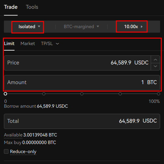 大多數加密貨幣槓桿交易平台在高級交易中使用類似的交易介面。選擇使用隔離保證金還是全倉保證金。然後,選擇您的槓桿倍數和交易金額。您也可以選擇限價單或市價單。限價單通常手續費較低,但可能不會立即執行(甚至可能完全不執行)。