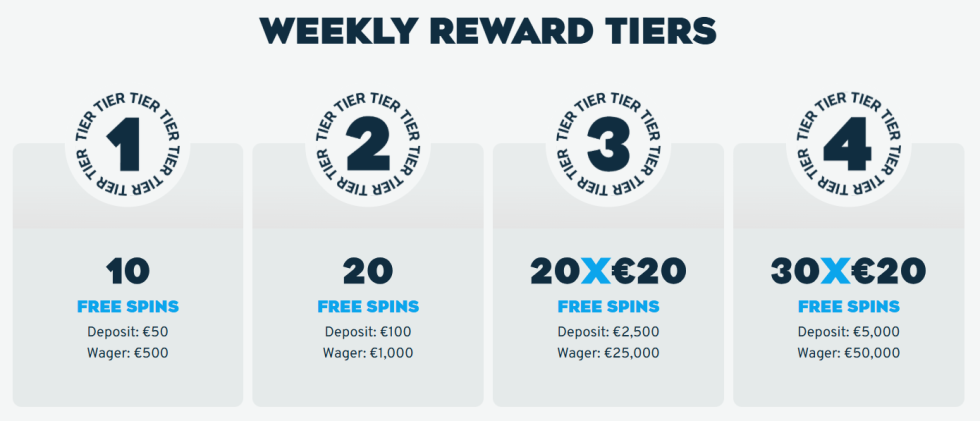 新用戶可享200%首存獎勵(上限$25,000)及50次《Wanted Dead or a Wild》免費旋轉。玩家每週三可獲兩次再儲值紅利,並參與「本週遊戲」活動,最多可得230次免費旋轉。平台同時舉辦高達$3,500獎金的老虎機競賽。
