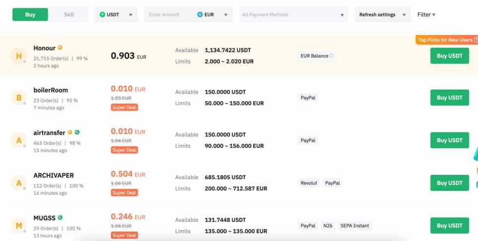 接受 900 多種付款方式,包括本地和地區銀行轉帳(如 SEPA)、Skrill、Neteller 和MasterCard Send。然後,Binance會顯示合適的賣家,從最佳匯率開始排列。賣家還可根據已完成交易的數量和平均付款時間進行篩選。