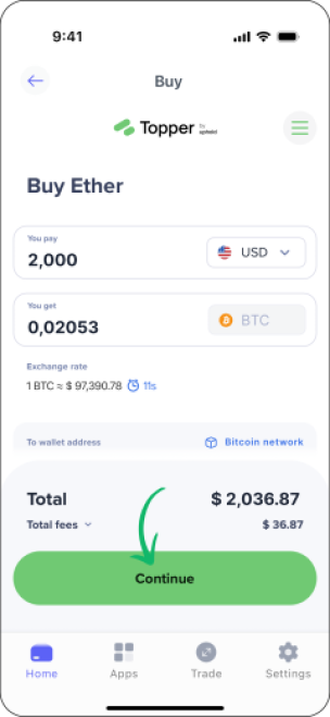 หมายเหตุ: แม้ว่ากระบวนการนี้จะดำเนินการผ่านผู้ให้บริการบุคคลที่สาม แต่เหรียญคริปโตที่คุณซื้อจะไปที่ Best Wallet ของคุณโดยตรง!