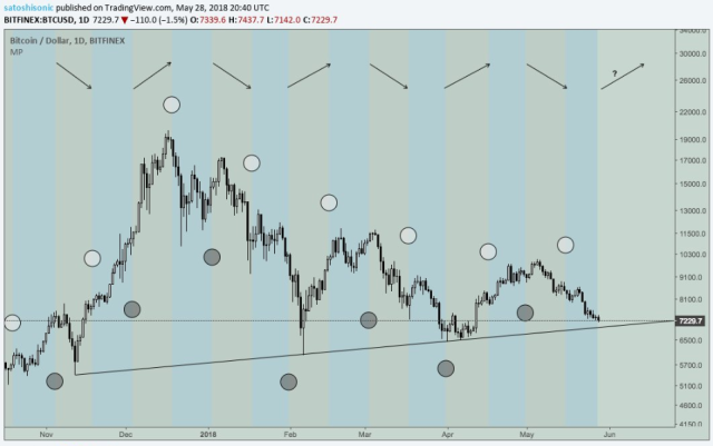 So this is quite possibly the most unscientific analysis I’ve seen in the crypto-market lately, and that’s saying a lot, but it’s not untrue. This graph posted on social media seems to plot the price of bitcoin against the cycles of the moon.