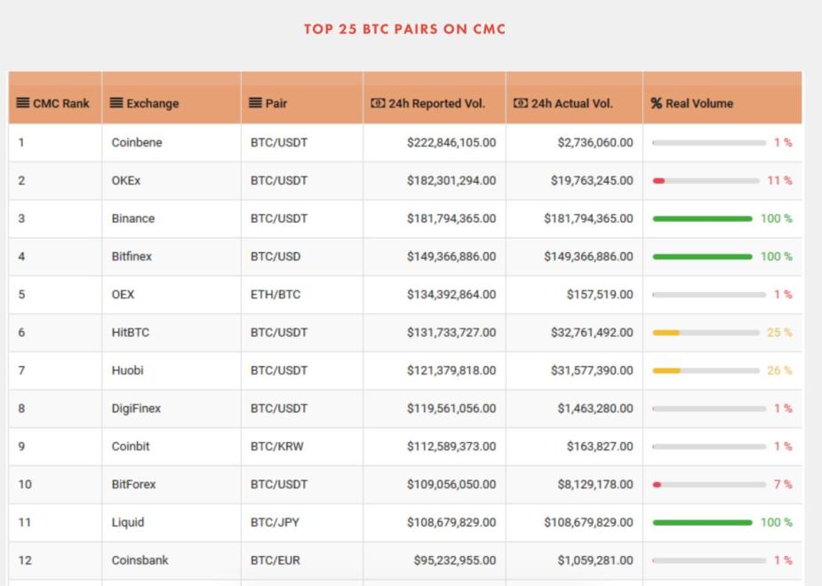 As part of the report, the Institute used its algorithm to calculate the true volume of the CMC top 25 Bitcoin trading pairs. It discovered that the vast majority of these have an actual volume of under 1% of that reported on CoinMarketCap.