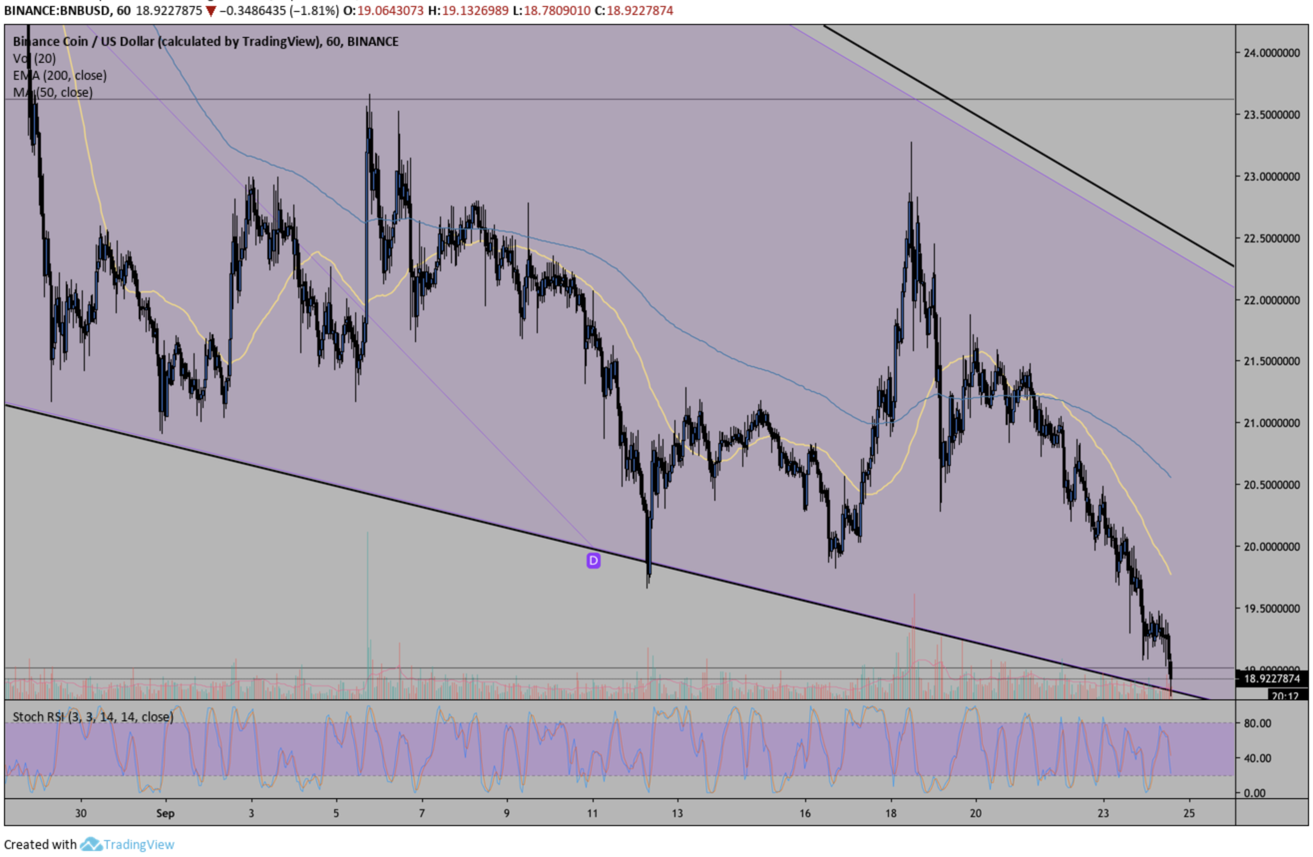 Both the 50 MA and 200 EMA are about to cross down signalling a bearish MA cross. However, if price levels bounce off the wedge support at $18.9 as mentioned in my hourly analysis the moving averages may not cross down in a bearish fashion. $18.9 is not only the visible wedge support but also the 38% fib level, meaning this a key level in determining the direction of BNB.