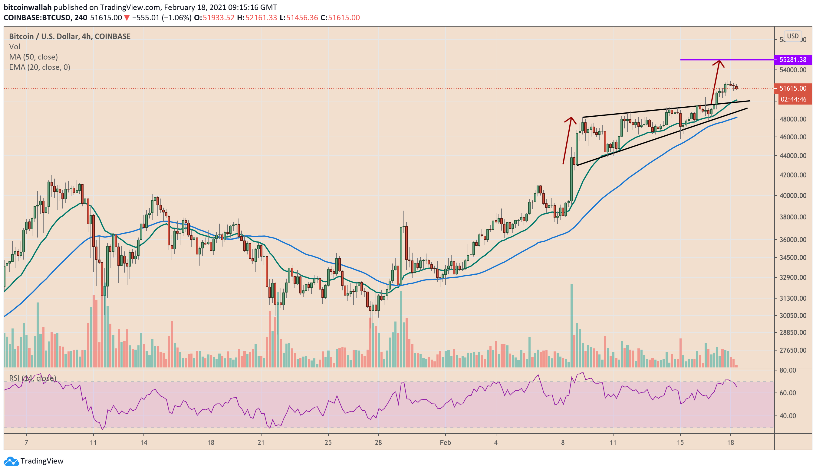 As observed in the four-hour chart, Bitcoin has broken bullish on its Rising Wedge pattern, otherwise a bearish reversal indicator.