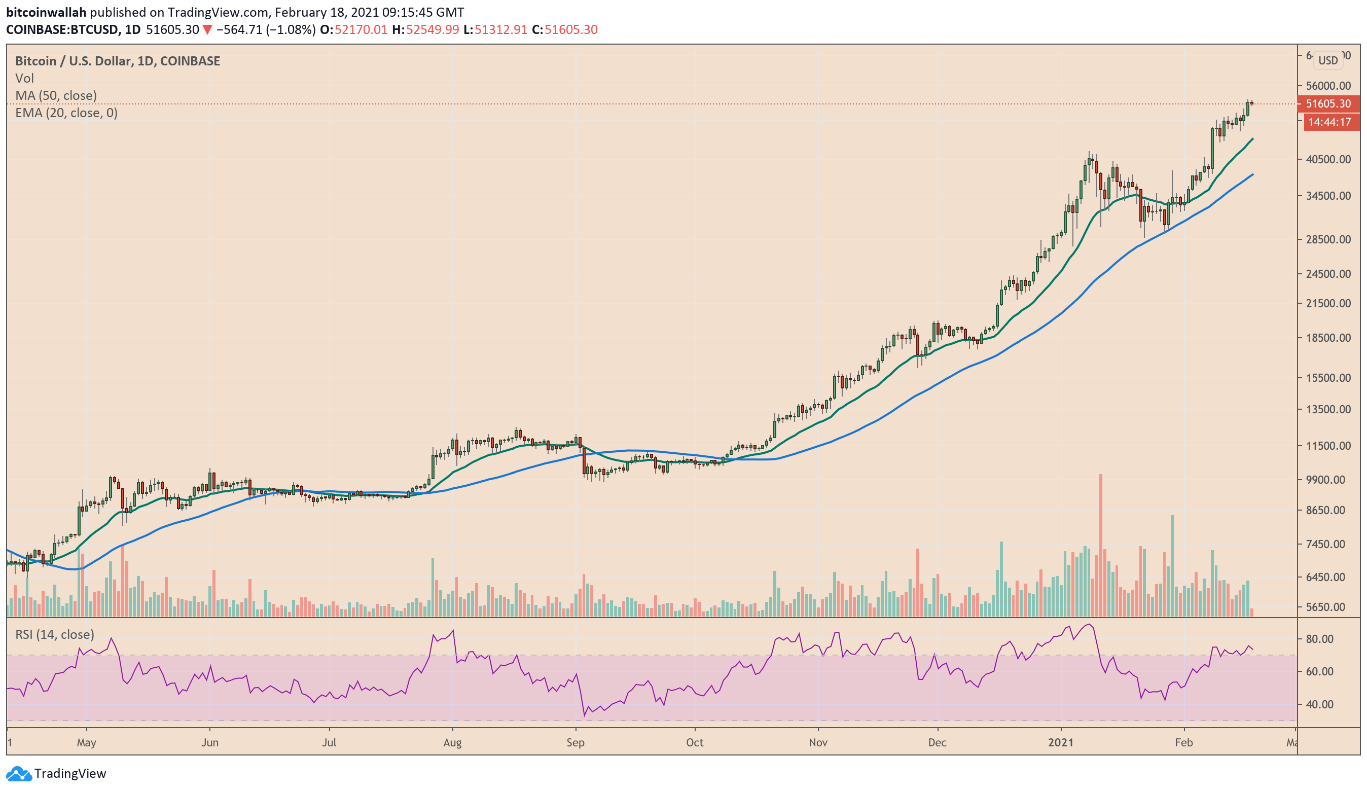 Bitcoin (BTC/USD) rose to its highest levels to date at $52,640 on Wednesday after the minutes from Federal Open Market Committee’s January meeting offered bullish guidance.