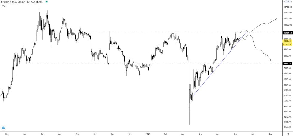 This trendline has been formed in the time following BTC’s mid-March meltdown, and one analyst recently offered a chart showing a downside target in the mid-$7,000 region if it is not defended by buyers.