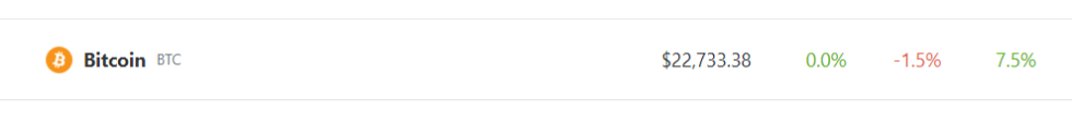 As of this writing, Bitcoin is trading at $22,733, up 7.5% in the last seven days, data from Coingecko shows.