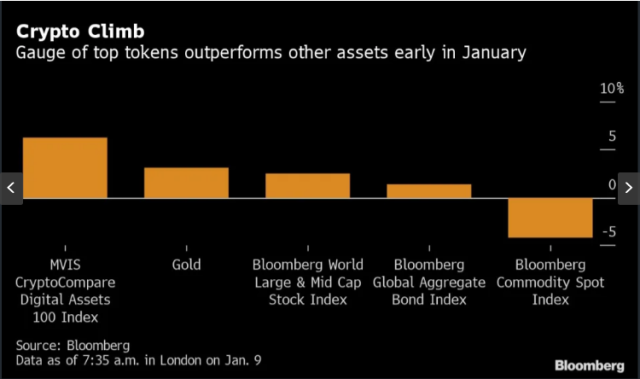 According to Bloomberg, the top 100 cryptocurrencies have outperformed both gold and large and mid cap stocks in the first few weeks of January. The MVIS CryptoCompare Digital Assets Top 100 Index returned 6% while gold and the Bloomberg Global Large and Mid Cap Index returned only 3% in the same timeframe.