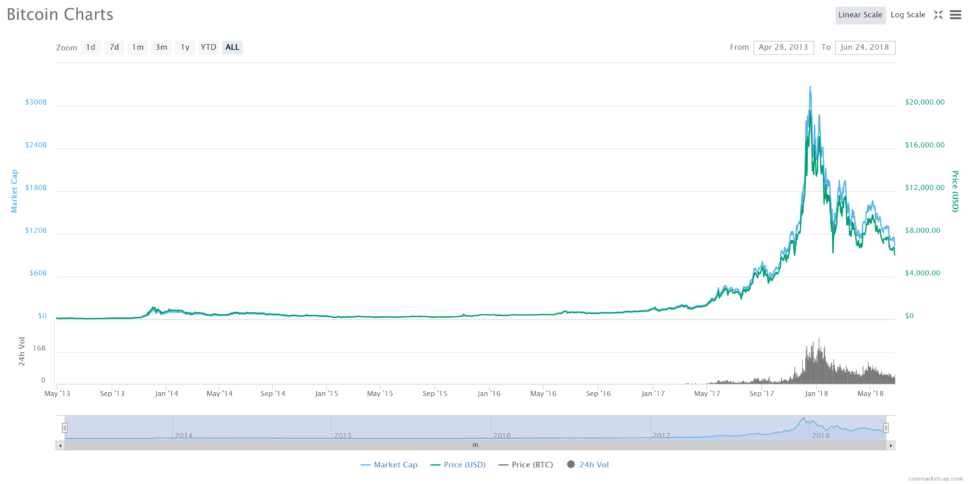 At the time of this writing, Bitcoin is currently trading at $5,955.19 — with all signs pointing to a continued downward trend.