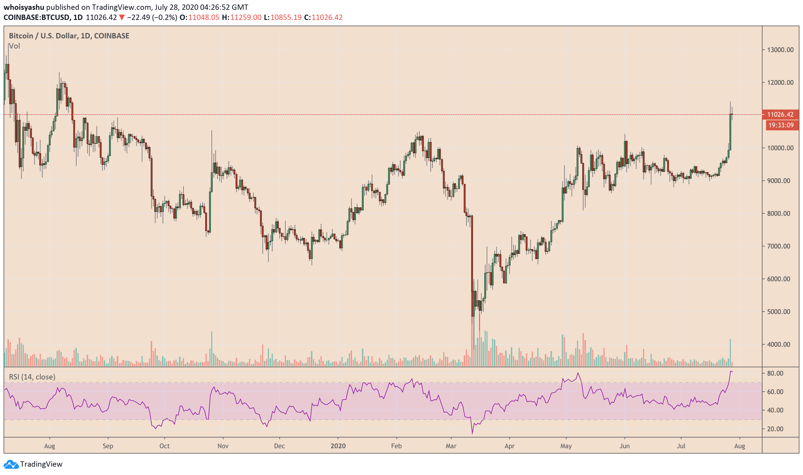 - Bitcoin leaped over the $11,000-level Monday for the first time since August 2019.