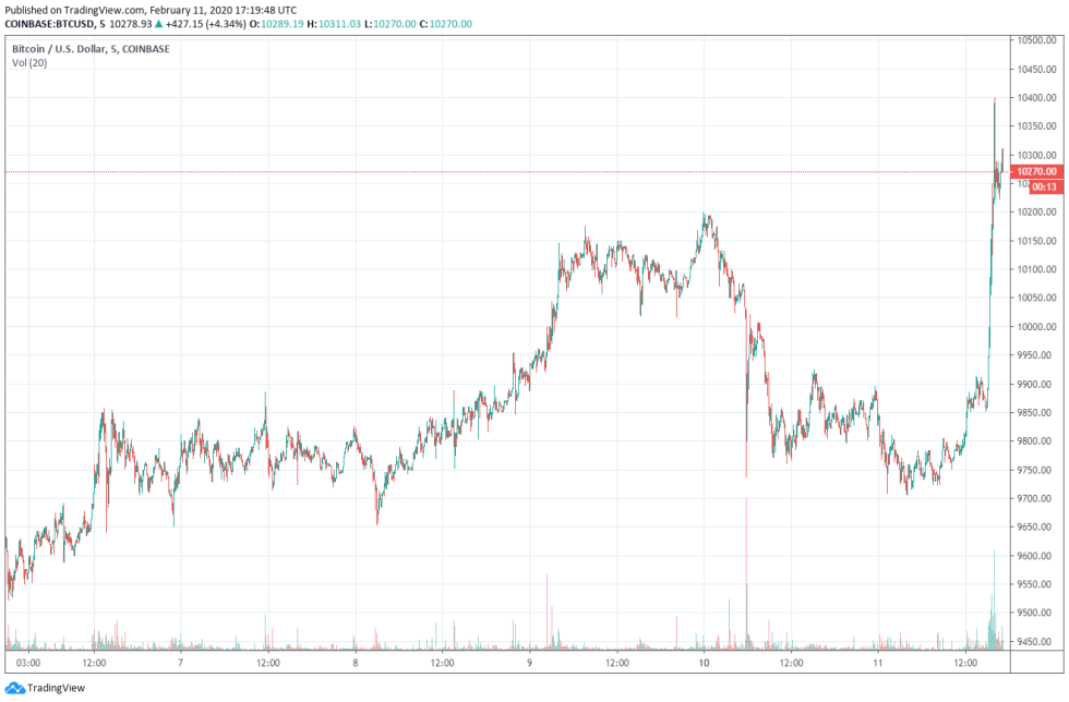 Bitcoin has now surpassed its recent high of $10,180 on February 9th, with no sign of a retracement. This upward price action has been swift. At one point the cryptocurrency moved up over $500 in under 6 hours, breaking $10,400.