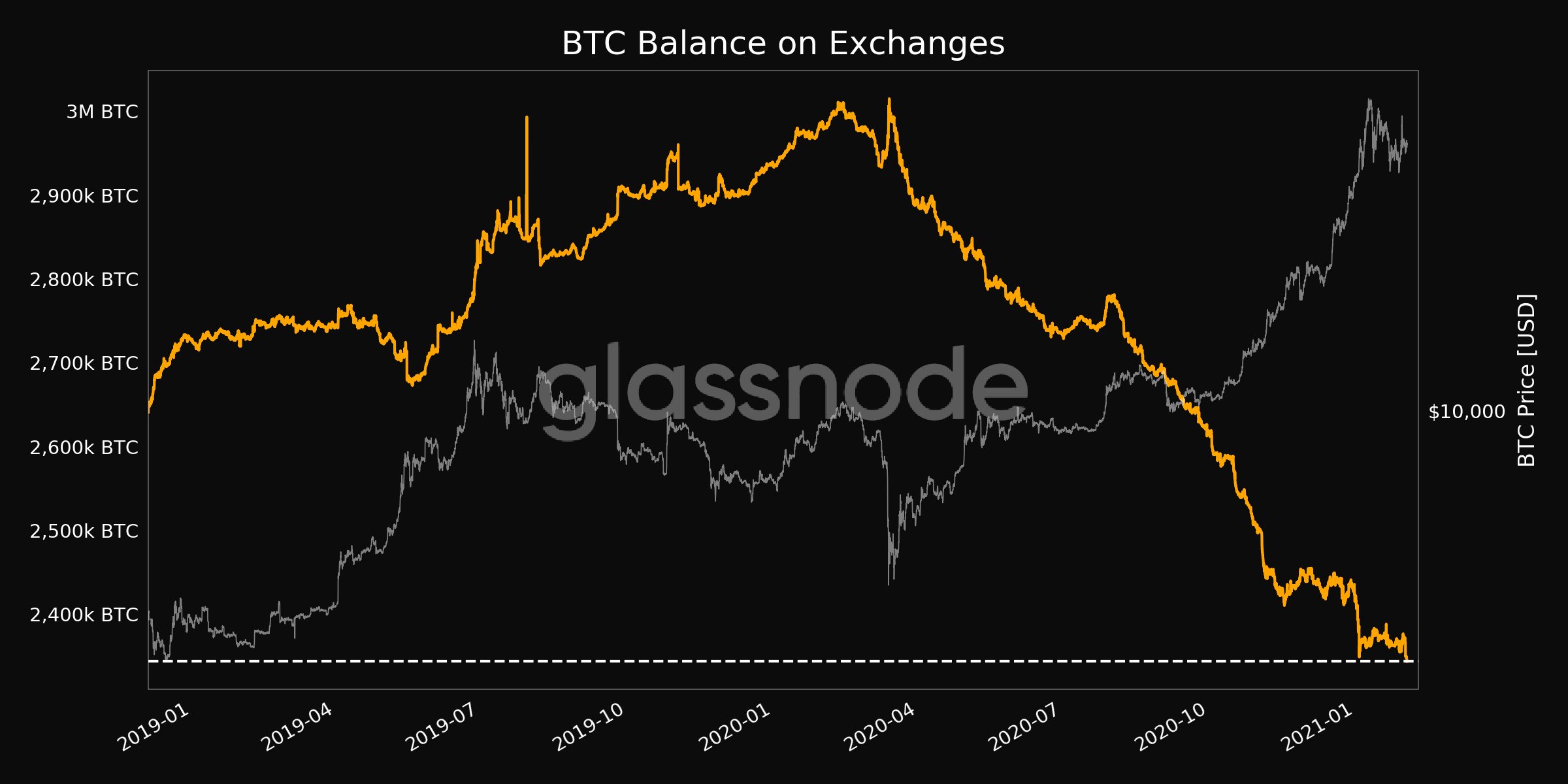 The prospect of a $1.9 trillion stimulus package coming out of the US and loose monetary policy from the Fed have provided tailwinds to Bitcoin’s bull run. Retail traders hold onto their cryptocurrencies in anticipation of an institutional boom, primarily after Wall Street players like Tesla, MicroStrategy, and Grayscale have revealed BTC accumulation worth billions of dollars.