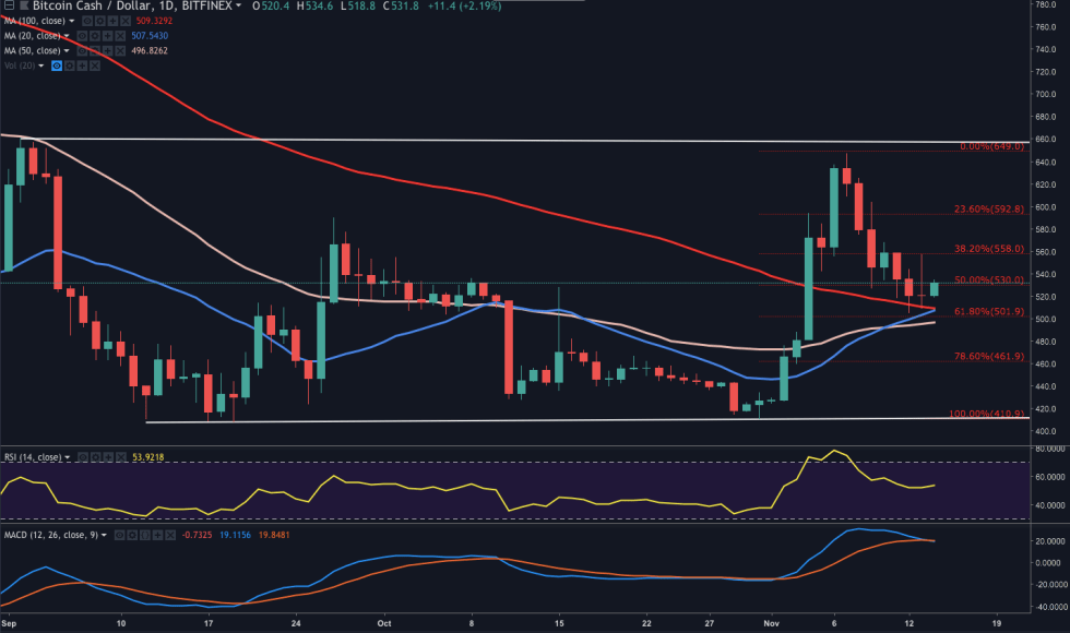 The 20-MA appears to be functioning as a solid support (aligns at 61.8% Fib Retracement ($500)) and currently BCH rides along the 100-MA. The RSI has started to curve upward into bullish territory as the 50-MA kisses the 20-MA and the MACD is crossed and slightly descends from bullish territory.